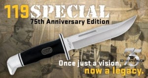 Through the duration of the contest, contestants are asked to submit their 119 or Buck Knives photos using #BuckKnives119 to Buck Knives’ Facebook, Instagram, or Twitter platforms. No purchase necessary. Each week, one winner will be chosen to receive a 119 Special 75th anniversary knife with black phenolic handle featuring the 75th anniversary medallion and aluminum pommel/guard. Genuine leather sheath included. The Grand Prize winner will receive a customized 119 Special and can choose from an available list of custom handle and blade materials to create their own custom knife valued at up to $400.